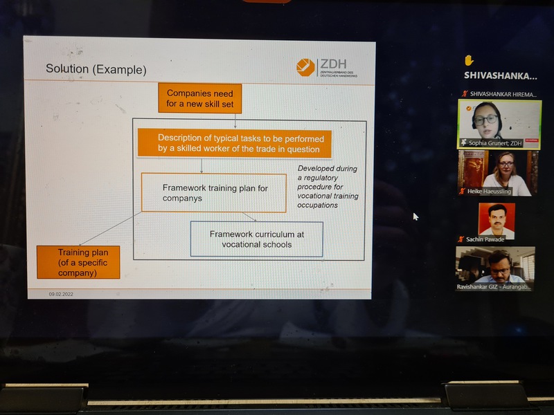 Die 5 Trainingstage waren so konzipiert, dass vormittags Online-Inputs von deutschen Experten statt fanden und nachmittags mit den beiden indischen Mastertrainern Mr. Minhir Udeshi and Mr. Tushar Chaudhary Lern- und Arbeitsaufgaben in der Praxis geübt und vertieft wurden. Als deutsche Experten standen Werner Hampel (www.robtec.de), Dr. Sebastian Groß und Sophia Grunert (ZDH) mit inspirierenden Vorträgen zur Verfügung. Mit Best practice Beispielen, Simulations-Tools sowie ausgiebigen Question & Answer-sessions konnten die Teilnehmer eine spannende Woche zum Abschluß ihres Trainings erleben.